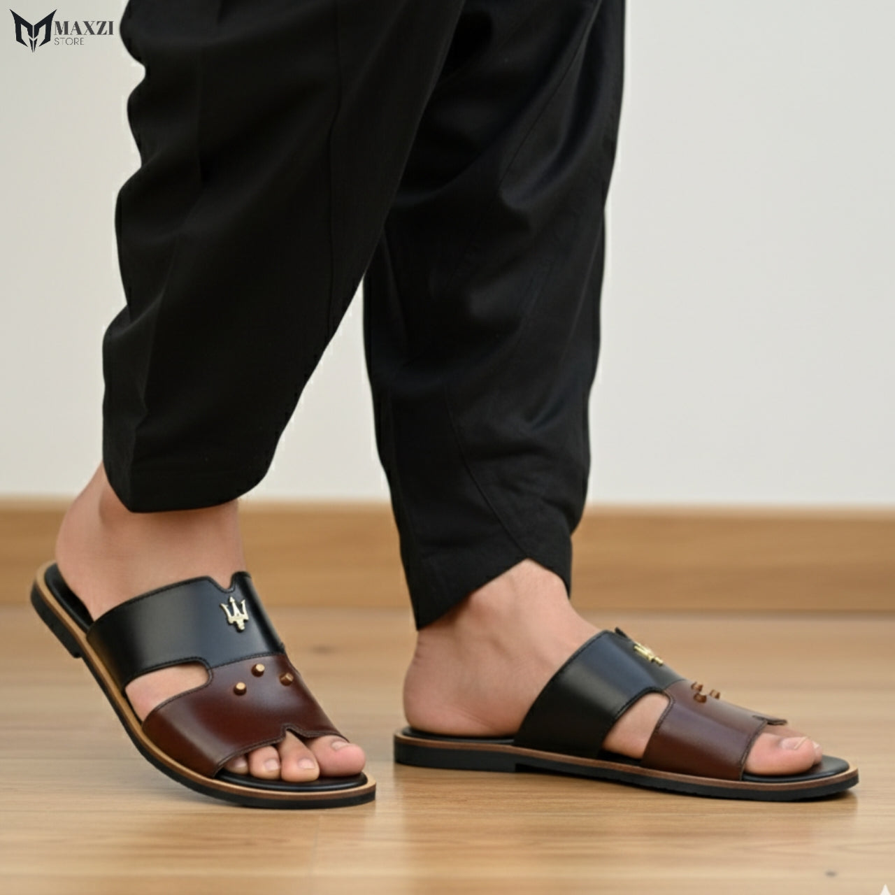 Step into ultimate comfort and refined style with our Men's Two-Tone Slide Sandals. These sandals are the perfect blend of luxury and casual sophistication, featuring a distinct design with a gold-tone logo on a black leather strap. The rich brown leather across the foot adds a contrasting element, highlighted by subtle studded details for a touch of modern edge. The cushioned footbed and durable outsole ensure a comfortable and secure fit, making them ideal for everything from poolside lounging to a stylish summer stroll.
